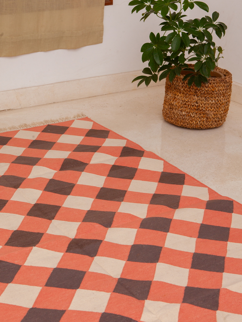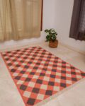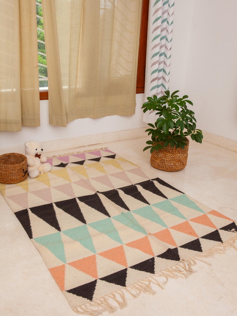 Kilim a flat-woven carpet or rug made in India.Traditionally, the kilim is woven using the slit-weave technique, in which a number of wefts are woven around the last warp of a single color, leaving small vertical gaps or slits between two or more wefts of different colors.