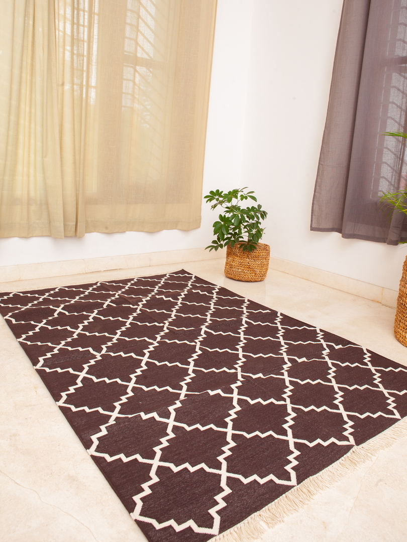 Kilim a flat-woven carpet or rug made in India.Traditionally, the kilim is woven using the slit-weave technique, in which a number of wefts are woven around the last warp of a single color, leaving small vertical gaps or slits between two or more wefts of different colors.