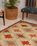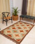 Kilim a flat-woven carpet or rug made in India.Traditionally, the kilim is woven using the slit-weave technique, in which a number of wefts are woven around the last warp of a single color, leaving small vertical gaps or slits between two or more wefts of different colors.